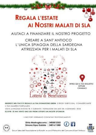 “Regala l’estate ai nostri malati di SLA”. E' lo slogan di una lotteria di beneficenza organizzata, col patrocinio del Comune, dall’associazione di volontariato “Le Rondini” attiva nel Sulcis-Iglesiente per la tutela dei malati gravi e gravissimi, che si propone di regalare un'estate felice agli ammalati di Sla di Sant'Antioco. La finalità è quella di trovare i fondi necessari per attrezzare un tratto di una spiaggia di Sant’Antioco affinché possa accogliere i malati di Sclerosi Laterale Amiotrofica (SlA), terribile patologia degenerativa che produce effetti disastrosi per la qualità della vita di chi ne è affetto. Così l’associazione di volontariato per raggiunge lo scopo ha organizzato una lotteria di beneficienza per la raccolta fondi a sostegno del progetto “Quando la disabilità non è un limite”, rivolto a soggetti colpiti da patologie altamente invalidanti. «Riteniamo corretto e doveroso sostenere questa proposta –commenta il sindaco Ignazio Locci– è una conquista di civiltà e per questo ci metteremo nella condizione di promuovere il progetto. È un sogno- conclude il sindaco- che vogliamo contribuire a realizzare». Il biglietto per partecipare alla lotteria, la cui estrazione averrà il 4 gennaio prossimo, può essere acquistato con offerta libera nelle attività commerciali convenzionate cittadine. In palio numerosi premi offerti dagli sponsor che hanno aderito all’iniziativa tra cui pernotazioni in albergo, cene e pizzate, buoni acquisto e persino dei gioielli.