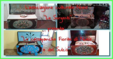 La seconda nasce da considerazioni storiche e dall’analisi delle pitture. Il gusto arabo delle decorazioni consente di dire che esse potrebbero essere legate al fenomeno di emigrazione dei Sardi verso l’Africa e verso Tunisi in particolare, grazie ai collegamenti marittimi Genova-Cagliari-Tunisi che diventarono settimanali dal 1852 con la compagnia Rubattino. In particolare è evidente l’abitudine araba di inserire la composizione floreale su vaso in cornice architettonica. Lo sviluppo stesso del mazzo di fiori, la stilizzazione accentuata e la tendenza ai colori solari sembrano ugualmente comuni. Queste casse sono ormai fuori produzione. Tuttavia sono ancora diffuse nelle famiglie del Sulcis ed è indispensabile che non se me perda alcuna. Importanti segni d’identità del Sulcis e della Sardegna, occorre recuperarle e valorizzarle. Noi di “Le Sorgenti” riteniamo che le casse debbano essere fotografate e inventariate. Un altro intendimento del gruppo è quello di “brevettarla” come prodotto tipico, come segno d’identità del Sulcis con l’intento di riavviarne la produzione.”