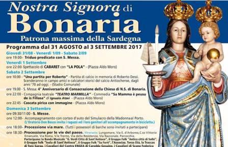Da venerdì primo settembre, anticipata da un triduo di preghiere, si svolgerà a Sant’Antioco, per tre giorni, la festa di Nostra Signora di Bonaria, patrona della parrocchia e del rione Acai. Una festa molto sentita sin dai tempi in cui il rione era abitato dalle famiglie degli operai della carbonifera da cui ha preso il nome. Ricco il programma dei festeggiamenti religiosi e civili, organizzati dal Comitato della festa i cui componenti sono: Cristian Piano, Lucia Marreddu, Paola Salidu, Stefania Bullegas, Patrizia Marreddu, Rina Basciu, Brunella Frau, Antonello Piredda, Mondo Frau, Luciano Schirru, Graziano Pusceddu, Giovanna Serrenti e dalla Parrocchia retta da don Giulio Coprongiu. Si inizia venerdì alle 22 con lo spettacolo di cabaret di “La Pola”. Sabato alle 10 una partita di calcio in ricordo di un animatore della festa scomparso recentemente e alle 22 la compagnaia “teatro Marmilla” presenterà la commedia in limba “Sa Mamma esti peus de is filas” a cui seguirà una cascata pirica con immagine. Domenica, giornata clou della festa. Al mattino sante messe. Dopo il traferimento al porto del simulacro della Vergien che sarà scortato da un corteo di auto e da fedeli in bicicletta, alle 18 la solenne processione a mare che partirà dal porto di Ponti per sbarcare alla banchina dcel lungomare a cui seguirà il corteo via terra sino alla parrocchiale dove il vescovo di Iglesias Monsignor Giovanni Paolo Zedda celebrerà la messa solenne. Alle 22 lo sparo dei fuochi artificiali anticiperanno il concerto dell' “Equipe 84” che chiuderà la festa 2017.