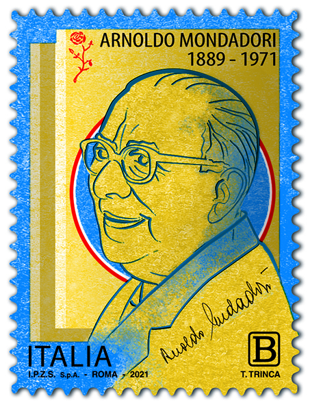 Poste Italiane comunica che oggi 8 giugno 2021 viene emesso dal Ministero dello Sviluppo Economico un francobollo commemorativo di Arnoldo Mondadori, nel 50° anniversario della scomparsa, relativo al valore della tariffa B pari a 1,10€. Tiratura: trecentomila esemplari. Foglio da quarantacinque esemplari. Il francobollo è stampato dall’Istituto Poligrafico e Zecca dello Stato S.p.A., in rotocalcografia, su carta bianca, patinata neutra, autoadesiva, non fluorescente. Bozzetto a cura di Tiziana Trinca. La vignetta raffigura un ritratto di Arnoldo Mondadori in primo piano su una delle più caratteristiche copertine della collana “Gialli Mondadori”, diventata nel tempo un iconico marchio editoriale rappresentativo di un particolare genere letterario. In alto a sinistra è riprodotto il logo storico della casa editrice Mondadori raffigurante una rosa stilizzata, emblema oggi della Fondazione Mondadori. L’elaborato è suggellato in basso a destra, dalla firma autografa di Arnoldo Mondadori.