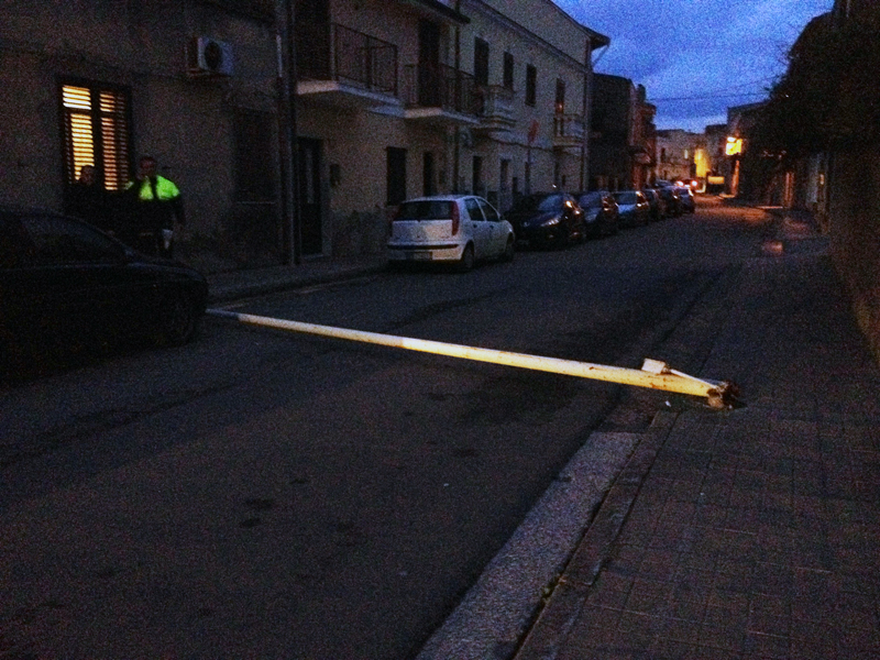 Colpa del vento o di scarsa manutenzione? Un palo di un lampione della luce in via Manno a Sant'Antioco èimprovvisamente caduto al suolo. E' finito sul tettuccio e poi sul cofano di una Lancia Y prima di schiantarsial suolo tra la lancia e un'altra auto. Erano circa le 19 di domenica sera quando sulla trafficata strada del centro storico si è sfiorata la tragedia. Sarebbe bastato che in quel momento in strada transitasse un'auto o un pedone percorresse il marciapiede. Per fortuna si registrano solo danni materiali. Sul posto sono intervenuti i vigili urbani che hanno provveduto a far sgomberare la via dal lampione e ripristinato il traffico viario.