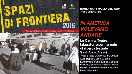 "In America volevamo andare". E' il lavoro teatrale che La Cernita Teatro, laboratorio permanente di ricerca teatrale Sant’Anna Arresi. presenterà domenica 13 marzo alle 19 al teatro di Bacu Abis per la VI edizione della rassegna Spazi di Frontiera.