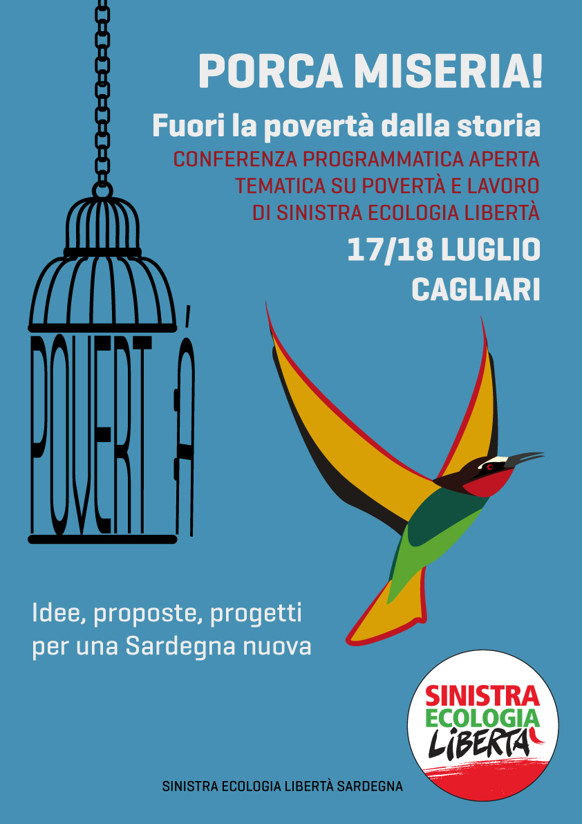 Abbiamo il dovere di confrontarci su questo tema, di costruire azioni di governo sociali e culturali per far uscire la nostra isola dalla povertà, per questo motivo il 17 e 18 luglio Sinistra Ecologia Libertà Sardegna organizza e ti invita a “Porca Miseria!". Parleremo di povertà e lavoro, e sarà un momento di ritrovo aperto, di discussione e partecipazione al mondo che vuole cambiare la Sardegna in un’ottica di emancipazione e di reale inclusione sociale.