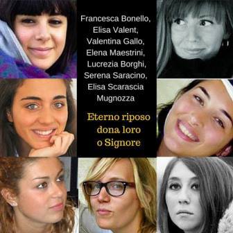 Intanto stamattina sono stati resi noti i nomi delle sette vittime. Si tratta di Francesca Bonello; Elisa Valent; Valentina Gallo; Elena Maestrini; Lucrezia Borghi; Serena Saracino; Elisa Scarascia Mugnozza. Le famiglie delle ragazze sono state avvisate. Sette viste spezzate di cui per il momento si sa ancora poca.